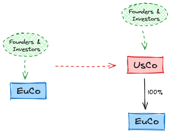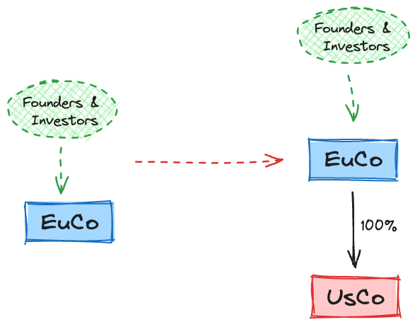Typically, the starting situation is one limited liability company incorporated in one of the EU countries (EuCo). The target structure is a USA corporation, usually a Delaware C-corp (UsCo), owned by the founders and the investors, and the UsCo wholly owns the previously existing EuCo. In the case of relocation to the UK, the diagram remains the same - replace UsCo with UkCo.